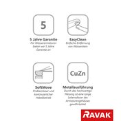 Für eine Komplettlösung sowie ein designmäßig aufeinander abgestimmtes Badezimmer empfehlen wir, die Batterie 10° Free mit den anderen Produkten des Konzepts 10° sowie mit weiteren Accessoires von RAVAK zu kombinieren. Für die äußere Reinigung empfehlen wir die Verwendung des Mittels RAVAK Cleaner Chrome.