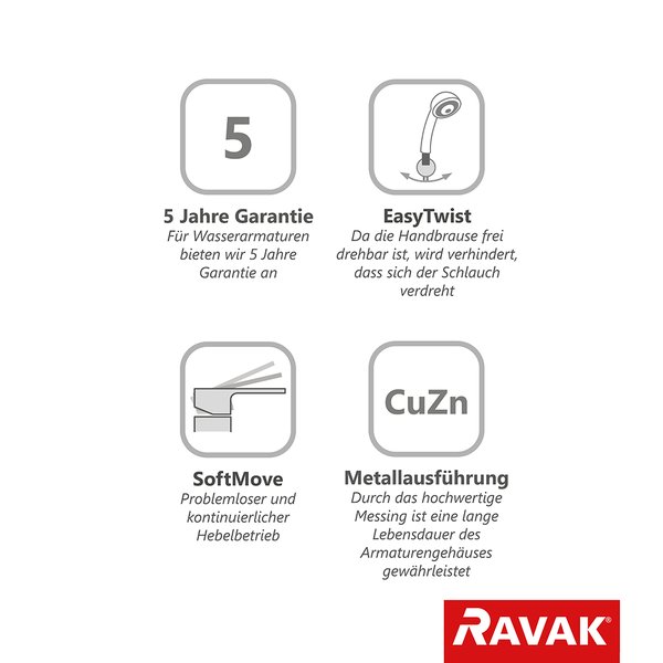 Alle Komponenten respektieren die RAVAK-Qualität, sodass Sie auch bei ihnen die 5jährige Garantie in Anspruch nehmen können.