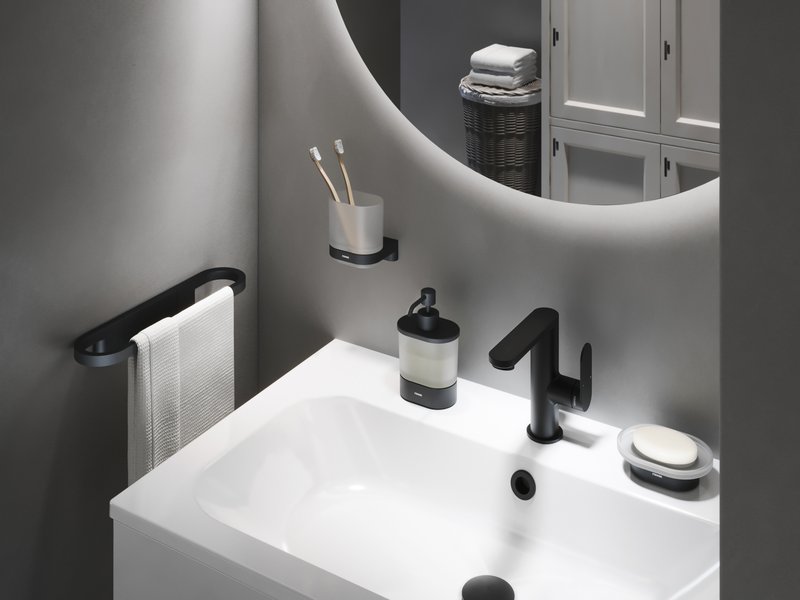 Der Halter mit zwei Zahnputzgläsern im Design Chrome II stellt ein ideales Accessoires für Zahnbürsten, Zahnpasta oder andere Dinge dar, die man schnell benötigt. Das Produkt ist in den Farben Chrome und Schwarz matt erhältlich.