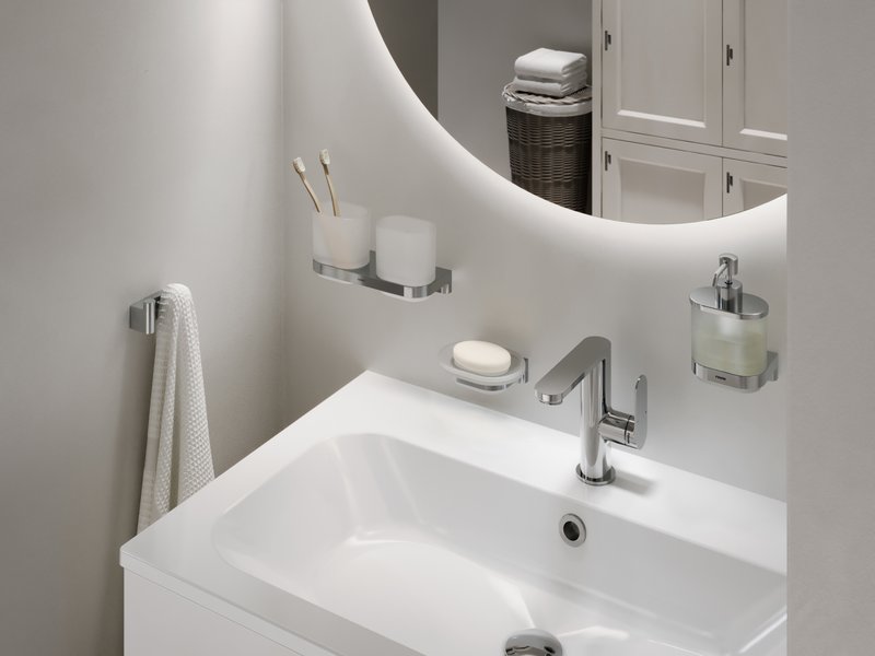 Der Halter mit Seifenspender im Design Chrome II mit praktischer Verwendung im Badezimmer zum schnellen Händewaschen. Das Produkt ist in den Farben Chrome und Schwarz matt erhältlich.
