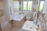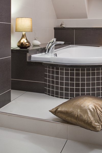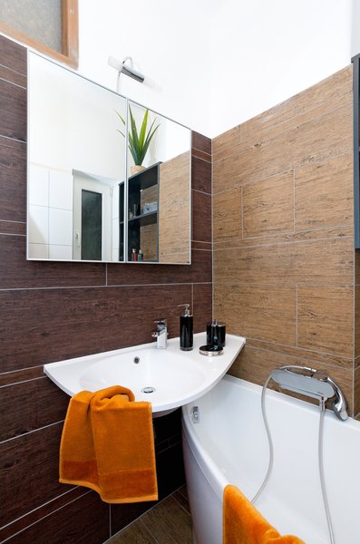 Das Mini-Badezimmer wurde durch die große Eckbadewanne so abgesperrt, dass man sich darin überhaupt nicht bewegen konnte. Der Eigentümer wollte aber auf Baden nicht verzichten, und daher blieb es uns nichts mehr übrig, als den Raum anders zu gestalten. In Zusammenarbeit mit der Designerin der Zeitschrift Marianne Wohnen schlugen wir vor, die Badewanne und das Waschbecken aus dem Konzept Avocado zu benutzen, welches für die kleineren Räume direkt vorgesehen ist. Das Waschbecken wir oberhalb der Badewann im Fußbereich installiert, nimmt somit nicht unnötig Platz ein und bietet trotzdem genügend Raum zum Waschen an. Der Ersatz der weißen Fliesen durch braune mit Holzdekor machten den Raum mehr gemütlich und warm. Auch die Mischarmaturen Chrome (Waschbecken- und Badewannen-Mischgarnituren), ebenfalls von RAVAK, stimmten den Raum optisch ab.
