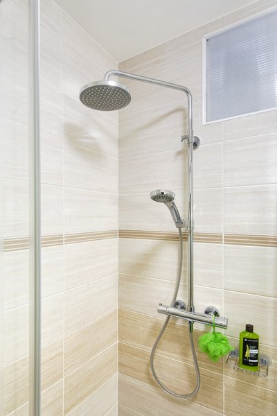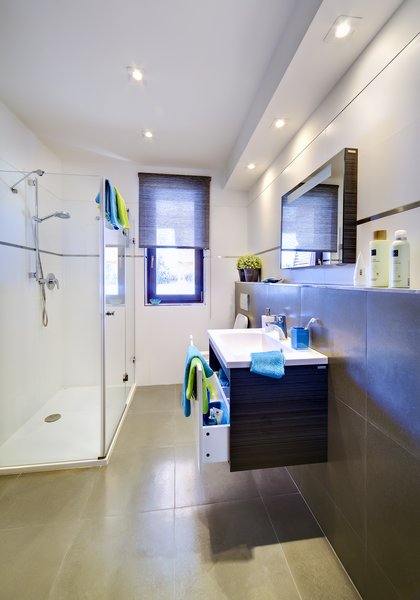 Wir richteten die Duschecke mit rostfreier Fußboden-Ablaufgarnitur ein, welche die Schönheit des keramischen Fußbodens hervorhebt und den komfortvollen Ablauf des gebrauchten Wassers gleichzeitig sichert. Beim Duschen kann die Langers Familie die Kopf- sowie Handdusche benutzen.