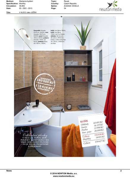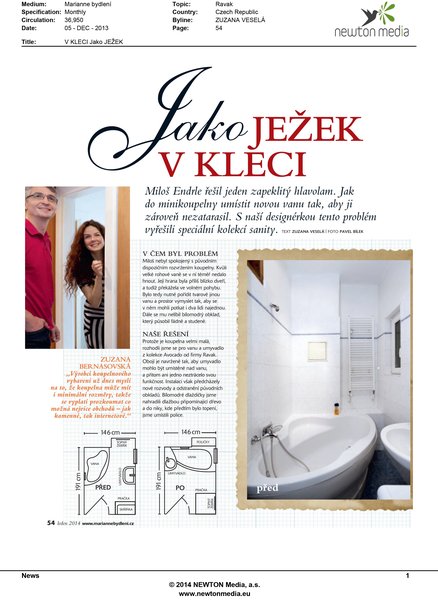 Die Geschicht beginnt mit einem Zufall sowie mit einem Kochtopf-Set. Dieses hat sich Lenka nämlich vor Kurzem für ihre Küche gekauft. Als Bonus zum Einkauf gab es die Zeitschrift Pěkné Bydlení (Schönes Wohnen) dazu, in welchem sie einen Leserwettbewerb entdeckte. Sie hat sich gesagt, dass sie ihr Glück probiert und hat das Bad und die Toilette im Plattenbau bei der Schwiegermutter fotografiert. Für den Umbau war nämlich kein Geld vorhanden und Frau Jedličková hatte auch keine Lust, die bestehenden Räume zu verändern. In den Plattenbau, welcher Ende der sechziger Jahre errichtet wurde, ist sie erst vor zwei Jahren gezogen. Mit ihrer Wohnung 2+1 (2 Zimmer+Bad+Küche), welche sich in der ersten Etage befindet, ist sie zufrieden. Der einzige Schwachpunkt war vor der Rekonstruktion der fast fünfzig Jahre alte "umakartové jádro" (die für alte Plattenbauten typischen Wände aus gepresstem Karton, der mit Kunststoff überzogen ist), der mit Ziegelimitationstapete versehen war. Die Badewanne mit dem ständig wackelnden, gebrochenen Fuß oder die Toilette mit dem tropfenden Spülbecken hatten schon bessere Zeiten gesehen. „Von Zeit zu Zeit mache ich bei einem Wettbewerb mit, und wenn ich schon gar nicht mehr daran denke, dann klappt es. Diesmal war es der dritte Versuch, ich habe auch an andere Zeitschriften geschrieben. Ich konnte es fast nicht glauben. Zwei Monate später hat sich die Redaktion bei mir gemeldet und mir mitgeteilt, dass ich gewonnen habe. Dies war genau der Moment, wo ich den Wettbewerb schon komplett vergessen hatte“, wie Lenka erzählt. Mit dem Badkonzept Chrome konnte ich aus dem umfangreichen Angebot eine Ausstattung auswählen, welche platzsparend und aufeinander abgestimmt ist. Das ovale Designelement ist zum Beispiel am Waschbeckenschrank und am Spiegel vorhanden. Seitens des Herstellers RAVAK wurde genehmigt, die Duschabtrennung Blix mit Glasgleittür aus einer anderen Kollektion auszuwählen, da eine Klapptür in einem so kleinen Raum nicht funktioniert hätte. Aus dem Katalog hat sich die Siegerin die entsprechende Badarmatur ausgewählt, einschließlich einer Kopfbrause in Kombination mit einer Handbrause.