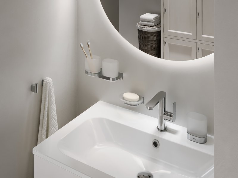 Der Halter mit Seifenschale im Design Chrome II mit praktischer Verwendung im Badezimmer zum schnellen Händewaschen. Das Produkt ist in den Farben Chrome und Schwarz matt erhältlich.