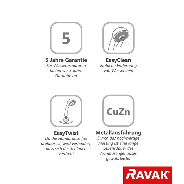 Alle Komponenten respektieren die RAVAK-Qualität, sodass Sie auch bei ihnen die 5jährige Garantie in Anspruch nehmen können.