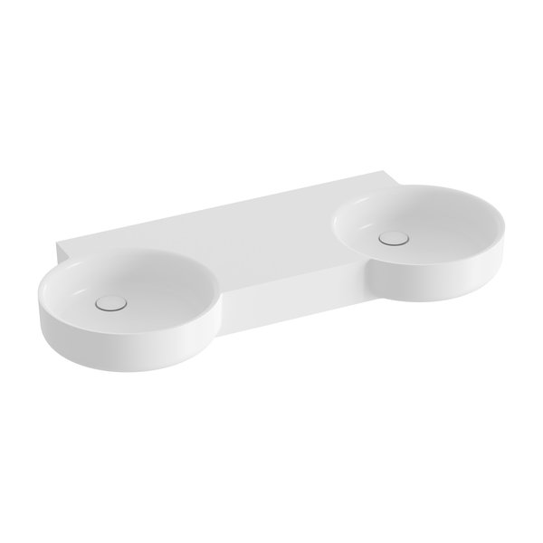 Double vasque en résine de synthèse ARC , sans trop-plein. Version blanche. Sans trou - à associer avec un mitigeur encastré. La vasque s’installe directement sur le mur.