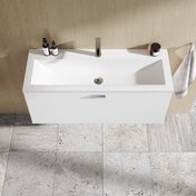 Les bords du meuble sous lavabo, précisément biseautés à un angle de 45°, s'adaptent parfaitement et créent sur le marché une solution d'une pureté exceptionnelle.