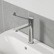 Mitigeur de vasque sur pied Safe avec levier médical, sans bonde. En finition chromée.