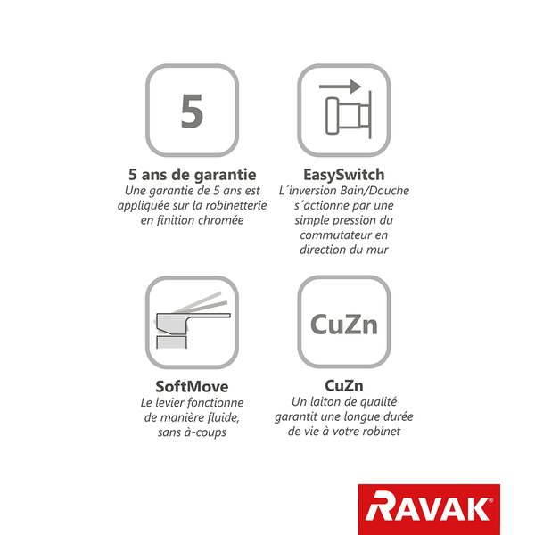 Afin d'obtenir une solution uniforme et une harmonie de style dans votre salle de bains, nous vous conseillons de combiner ce mitigeur 10° avec les autres produits de la gamme 10° ou avec d'autres produits RAVAK. Il est conseillé de nettoyer l'extérieur de cette robinetterie avec le produit RAVAK Cleaner Chrome.